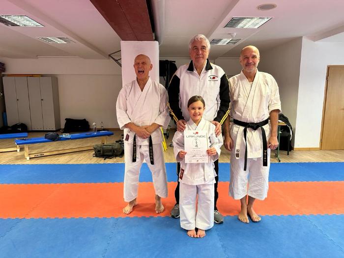 Etwas Besonderes erwartete die 9-jährige Frieda Puhlmann. Sie durfte in der Runde der DAN- Träger ihr Können zeigen, verbunden mit der Prüfung zum 8. Kyu, welche sie mit hervorragend absolvierte und sich damit den Respekt der Schwarz- Gurte sicherte.