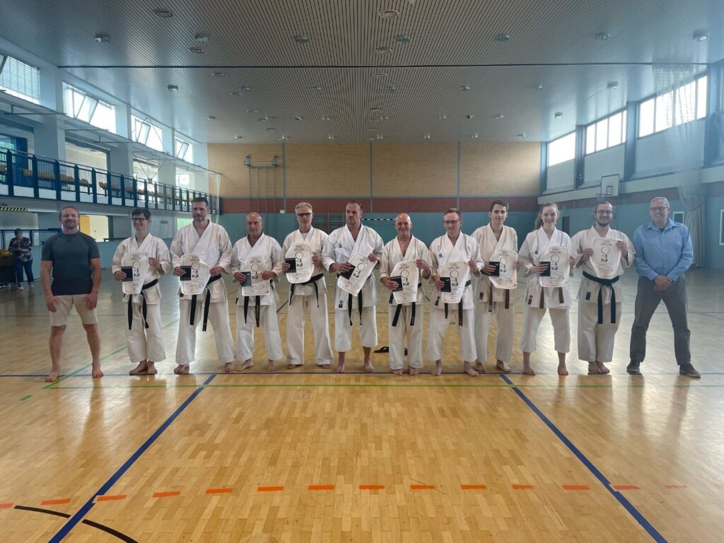 Für zehn Karateka gipfelte der Lehrgang nach vielen fleißigen Trainingsjahren und unzähligen intensiven vorbereitenden Extratrainingseinheiten in einer Dan-Prüfung. Bereits am Vortag fand ein anderthalbstündiges letztes Dan-Vorbereitungstraining (Teilnahme ab 3. Kyu) statt. Der Lohn der Mühe: Alle Dan-Prüflinge zum ersten, zweiten, dritten und vierten Dan bestanden ihre Prüfung und konnten stolz auf ihren Erfolg nach Hause fahren.