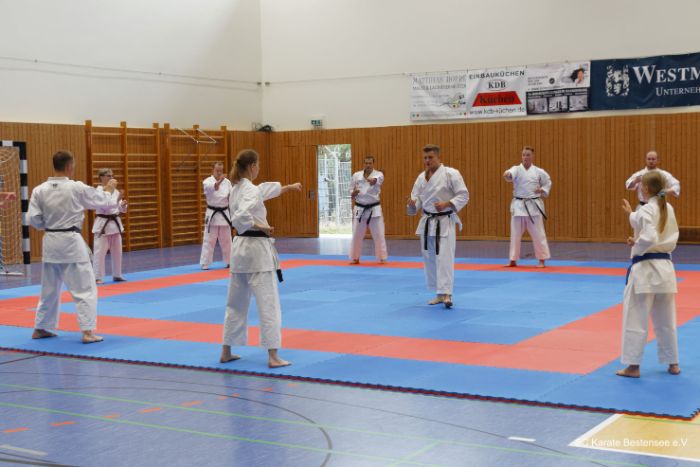 Der KDB-Tag fand am 5. September nun zum fünften Mal in Folge in Bestensee statt. Die Veranstaltung stand – wie könnte es anders sein – in diesem Jahr im Zeichen der Corona-Pandemie. Das bedeutet, dass ein mit der Gemeinde Bestensee vereinbartes Hygiene-Konzept einzuhalten und etwas weniger Teilnehmer zu verzeichnen waren als in den vorangegangenen Jahren. Immerhin waren es am Ende dann doch über 120 Karateinteressierte aus allen Teilen Brandenburgs, die in Bestensee zusammengekommen waren.
