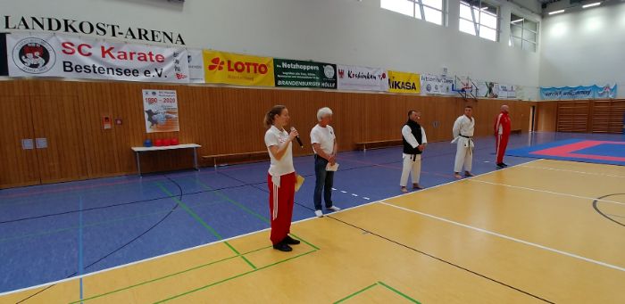 Zu Beginn der Mittagspause begrüßte der Bestenseer Bürgermeister, Klaus-Dieter Quasdorf, die versammelten Athleten und den KDB und gratulierte dem SC Karate Bestensee zum 30jährigen Gründungsjubiläum. Manja Lenk und Bodo Pippel gratulierten im Namen des Landesverbandes und überreichten eine „Ehrenplakette in Silber mit Gold“ – wie es in der Urkunde heißt – des Bundesverbandes DKV für die von so vielen engagierten Mitgliedern im Verein geleistete Vereinsarbeit.