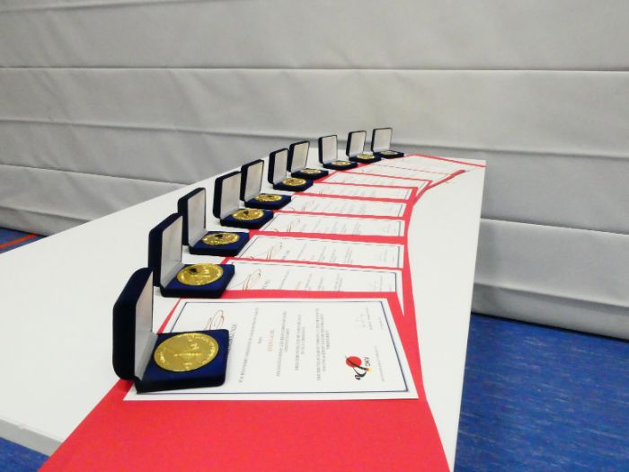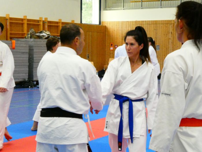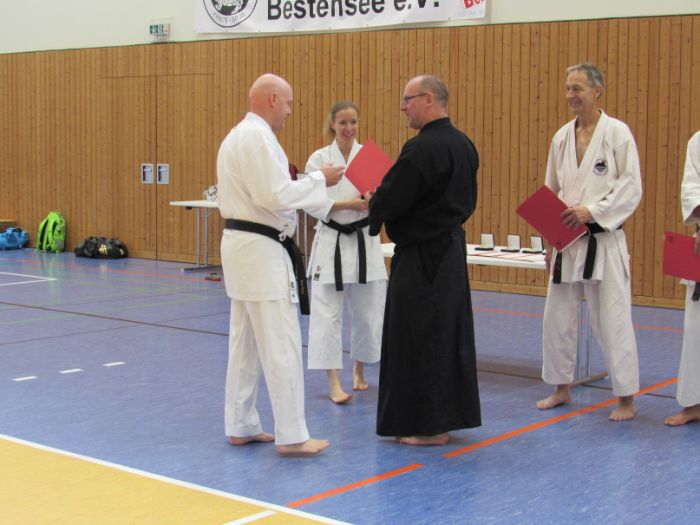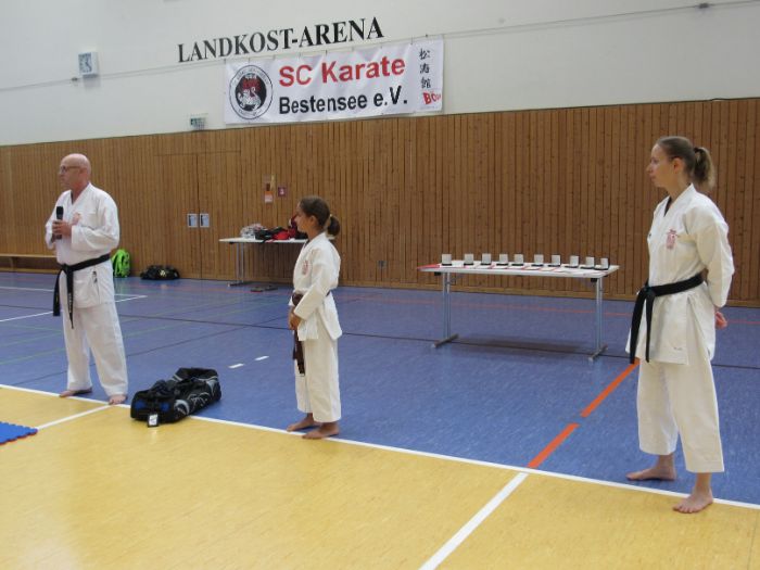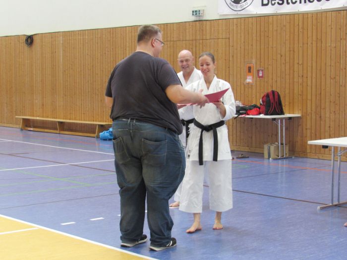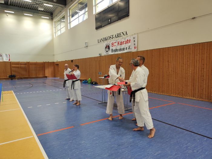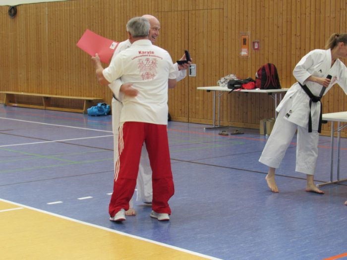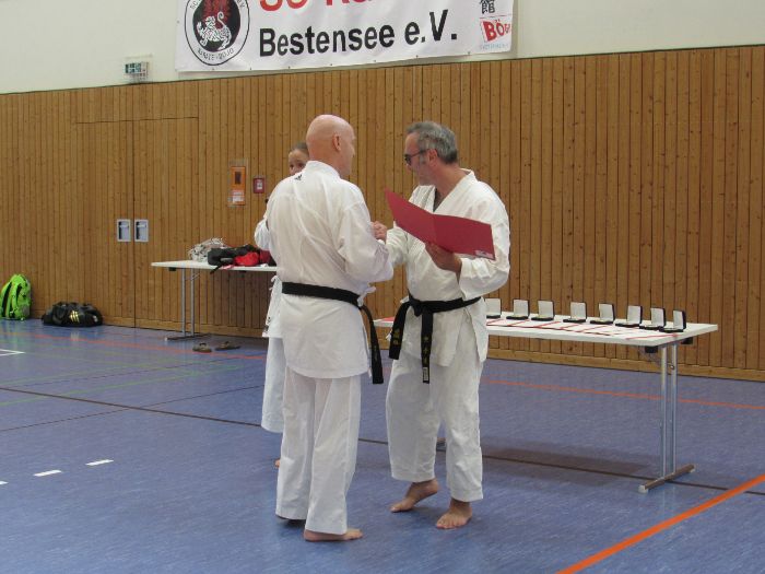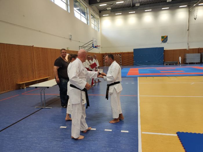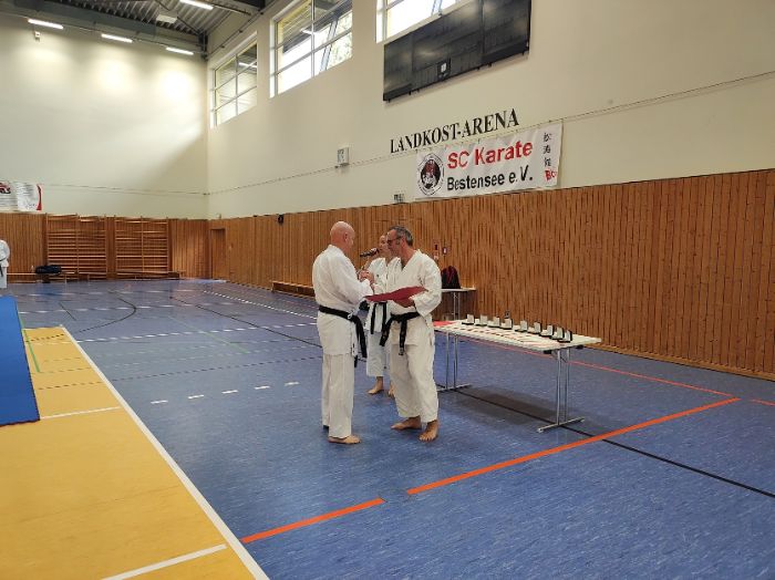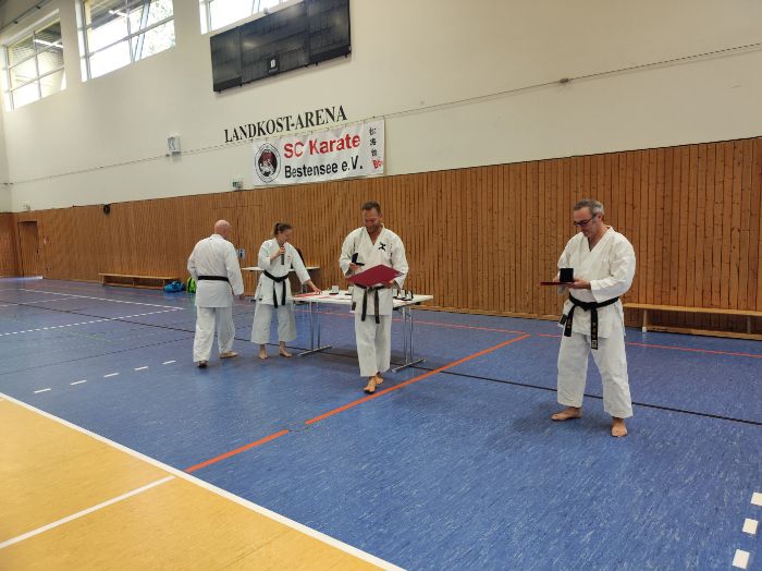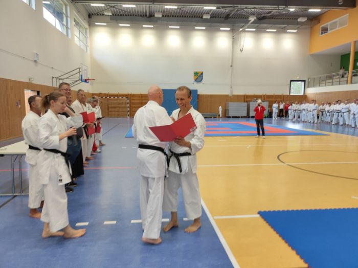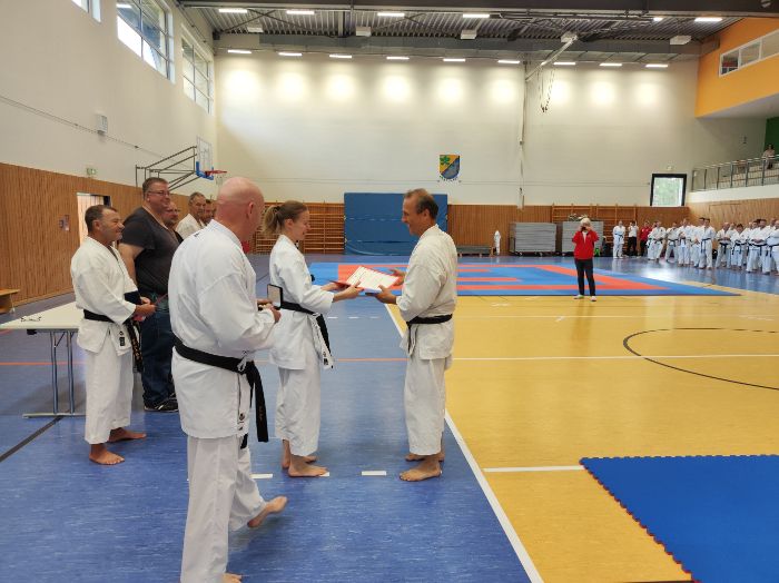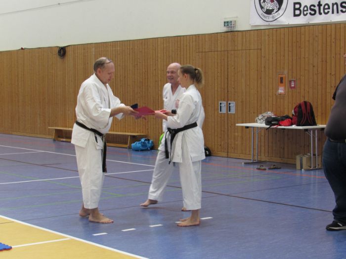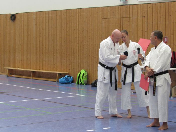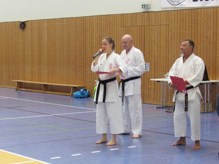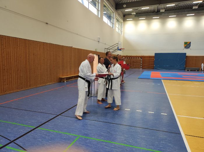 Zwischen den Trainingseinheiten versammelten sich alle Karateka in der Halle für den feierlichen Teil des Tages. Zunächst nahm Vizepräsident Sport, Bodo Pippel, die Ehrung von Daria Gruber vor. Daria hat mit dem Gewinn des Vizemeistertitels bei der Deutschen Meisterschaft im Bereich Kata für einen der größten Erfolge in dieser Disziplin in den letzten Jahren gesorgt.