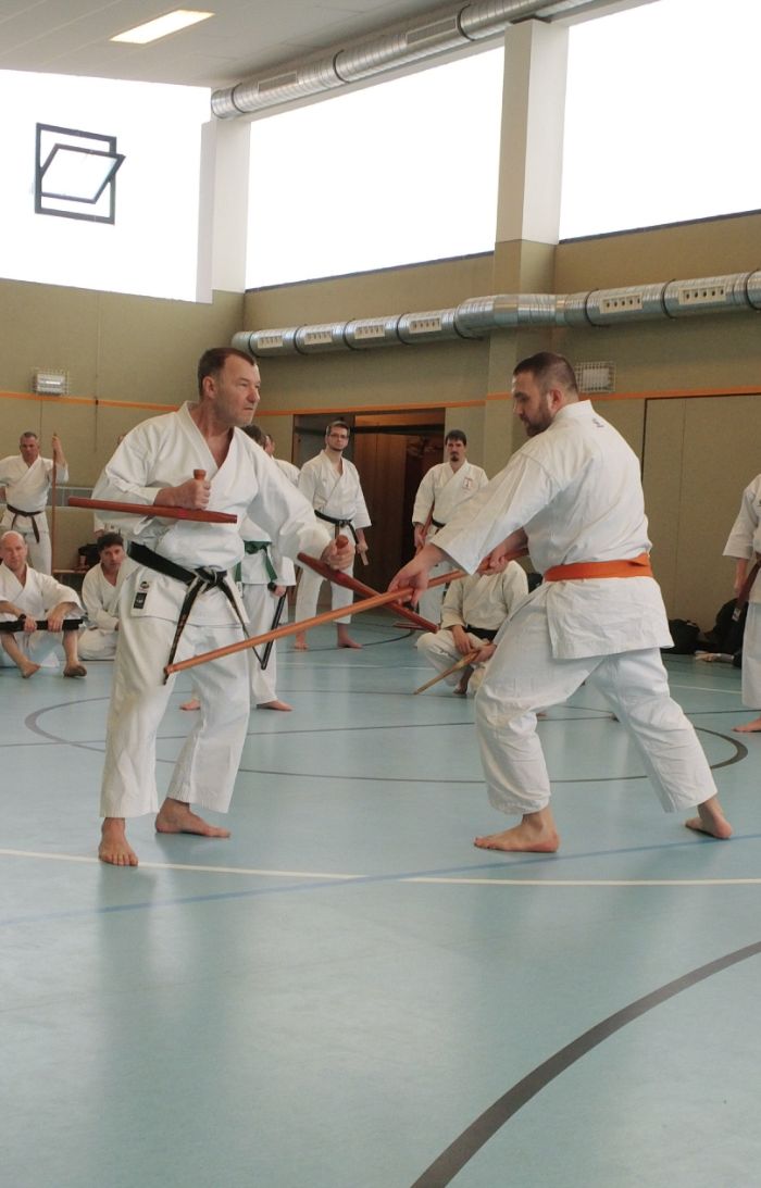 Es wurden die Zusammenhänge zwischen Karate und dem Tonfa anschaulich durch Übungen in den einzelnen Karate Kata, sowie die Anwendungen gegen einen Bo veranschaulicht und geübt. Desweiteren wurde die traditionelle Anwendung mit zwei Tonfa, sowie der Unterschied zum modernen, der von Sicherheitskräften benutzte Schlagstock erklärt und trainiert!